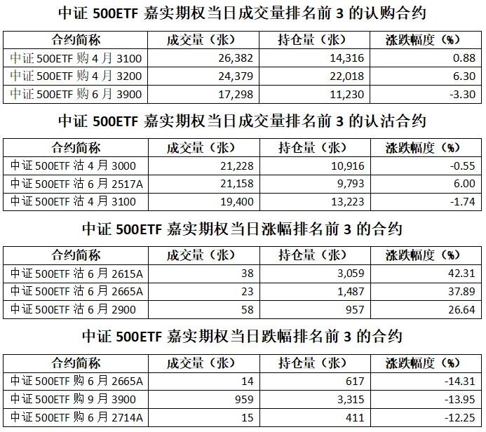 中证500ETF嘉实期权总成交面额87.55亿元,减少2.98%,期现成交比为0.02,权利金成交额1.51亿元;期权总成交量275,944张,减少2.65%,其中认购期权成交量147,364张,认沽期权成交量128,580张,认沽认购成交比率为0.87(上一交易日认沽认购成交比率为0.82)。