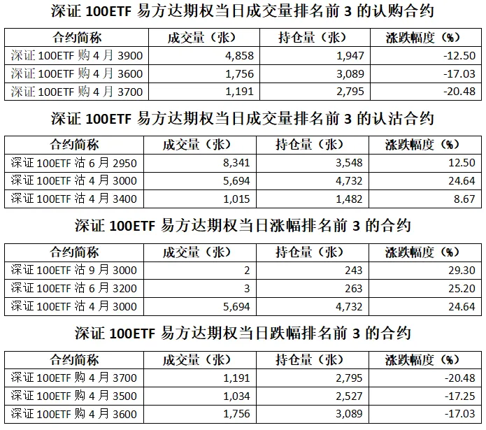 深证100ETF易方达期权总成交面额9.97亿元,增加13.30%,期现成交比为0.01,权利金成交额0.11亿元;期权总成交量30,098张,增加10.95%,其中认购期权成交量12,003张,认沽期权成交量18,095张,认沽认购成交比率为1.51(上一交易日认沽认购成交比率为2.23)。