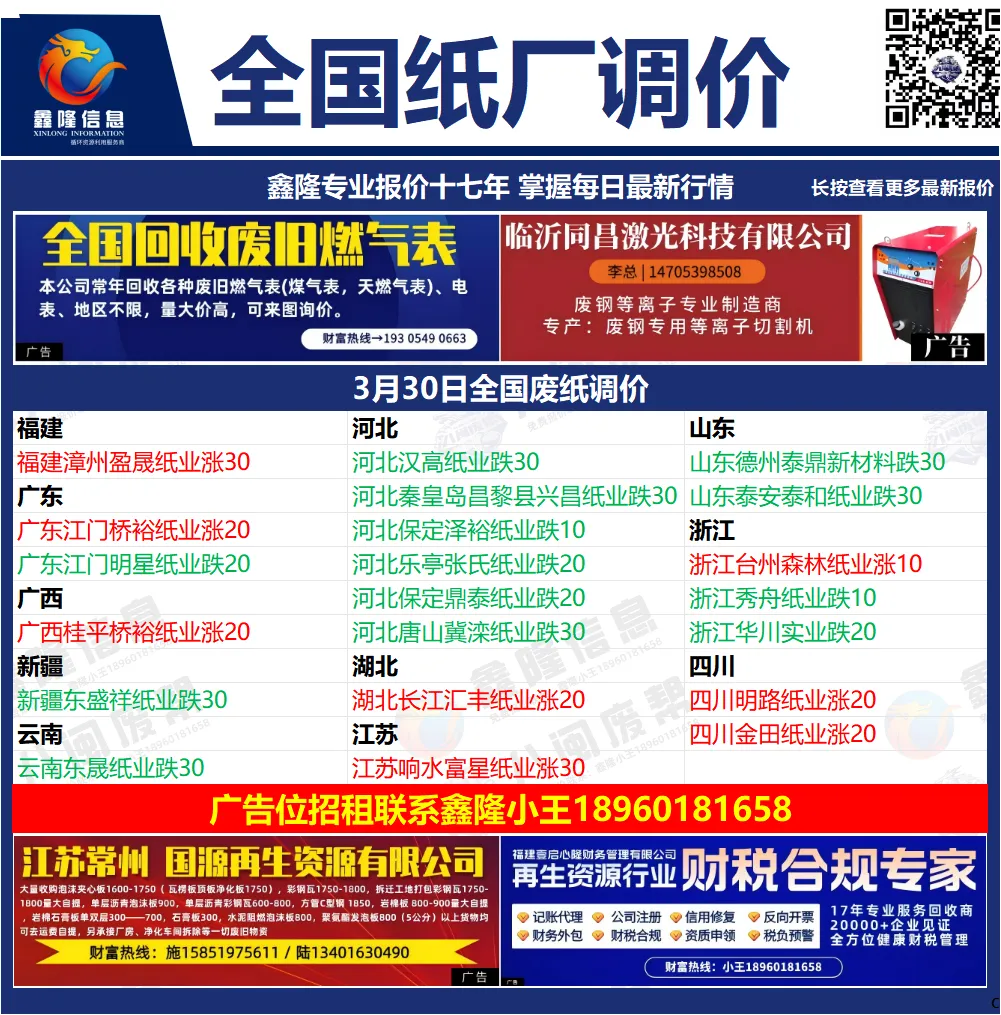 最新废纸调价汇总图已备好!完整调价下滑就能查看,回收老板别错过~⬇⬇⬇⬇精彩在下面