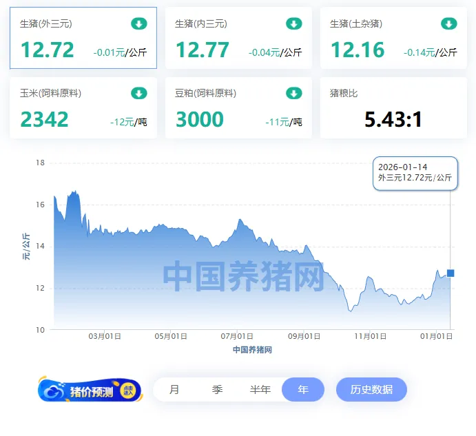 2026年1月14日全国外三元均价12.72元/公斤,今日猪价较昨日报价下跌了0.01元/公斤。