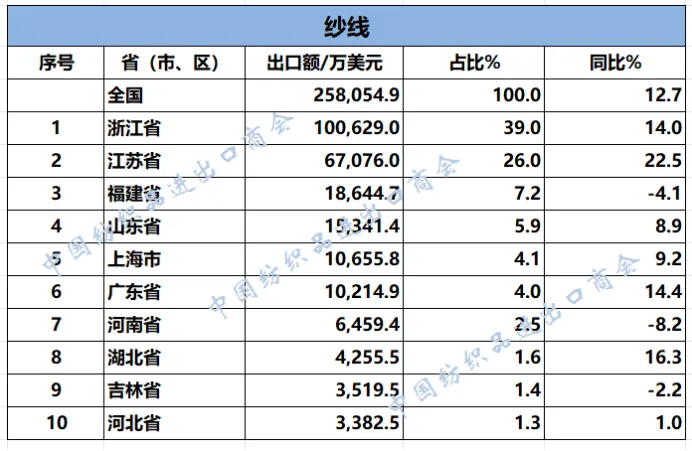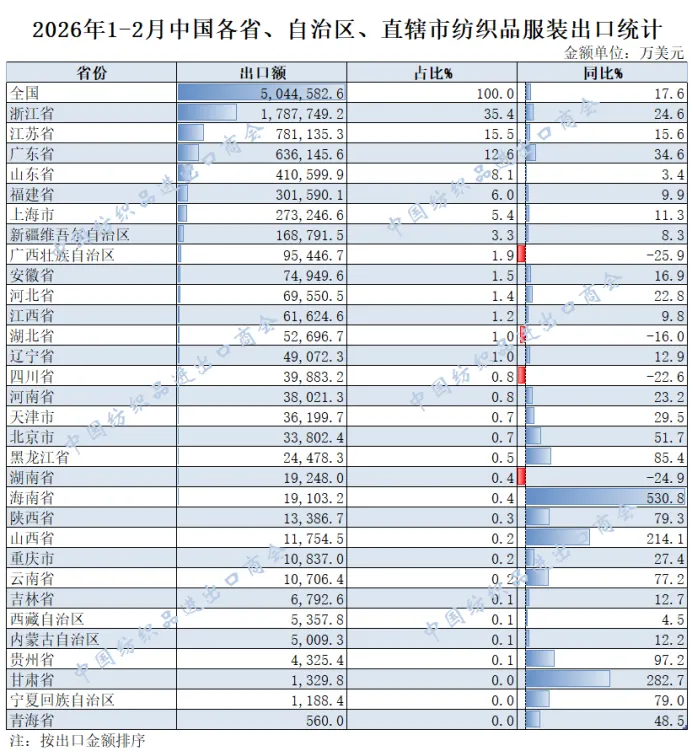 2026年1-2月,我国纺织服装累计出口504.46亿美元,同比增长17.6%。内地31个省、自治区、直辖市纺织服装统计数据已出炉,浙江省、江苏省、广东省、山东省、福建省分别列全国纺织服装出口省市前五位,合计比重超七成。2026年1-2月纺织服装类