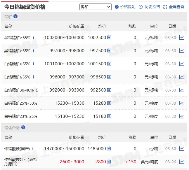 黑钨精矿≥65% | 1002000~1003000 | 1002500 | 0(较上一交易日微跌 0.5 万 / 吨) | 元 / 标吨 |