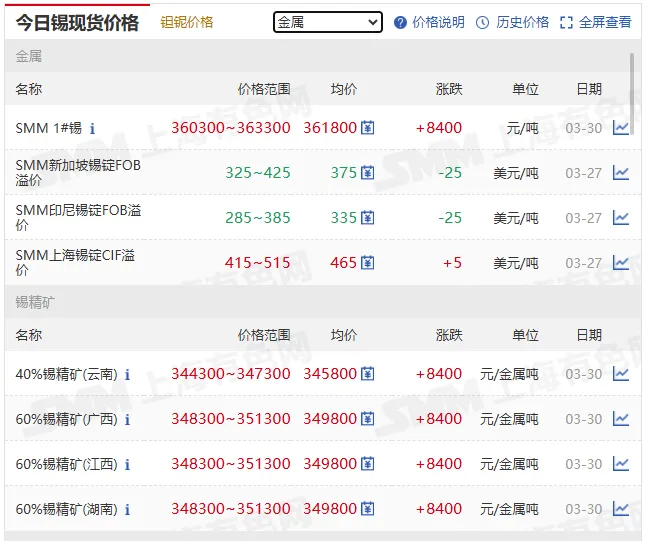 沪锡主力合约 | 362460 | - | +11460(+3.16%) | 元 / 吨 |