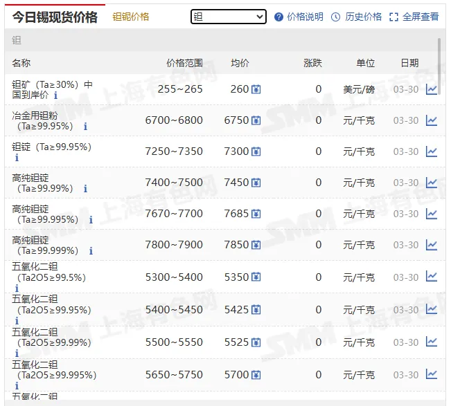 钽锭(≥99.95%) | 7300~7500 | 7400 | +100(+1.37%) | 元 / 公斤 |
