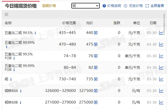铌铁(FeNb65%) | 48.68 | - | +0.23(+0.47%) | 美元 / 公斤铌 |