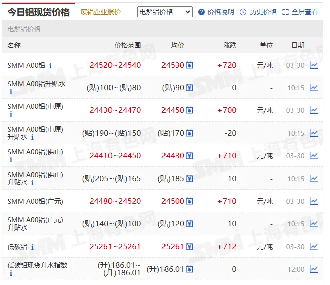A00 铝锭(上海现货) | 24500~24540 | 24520 | +710(+2.98%) | 元 / 吨 |