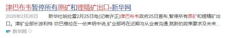 2.津巴布韦政策收紧:该国2 月起全面禁止锂原矿及精矿出口,新政直接抬升单吨碳酸锂成本近千元。且政策持续收紧,无松动迹象,5 月国内锂原料刚性缺口将加速显现。