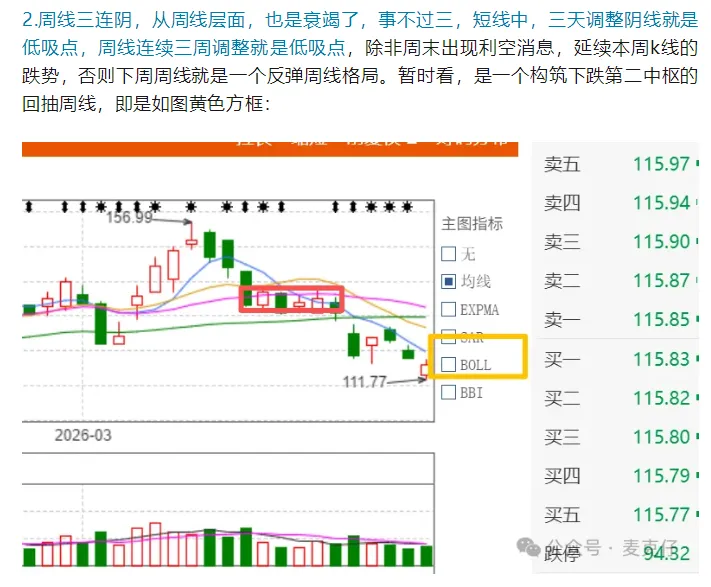 2.上周五的文章,博主也只是预判本周是反弹预期,这里开始构筑第二个箱体中枢,今天的走势是符合的,我可没说111.77不会跌破,也没说只能涨不能跌,看文章建议看认真点吧,原文如图: