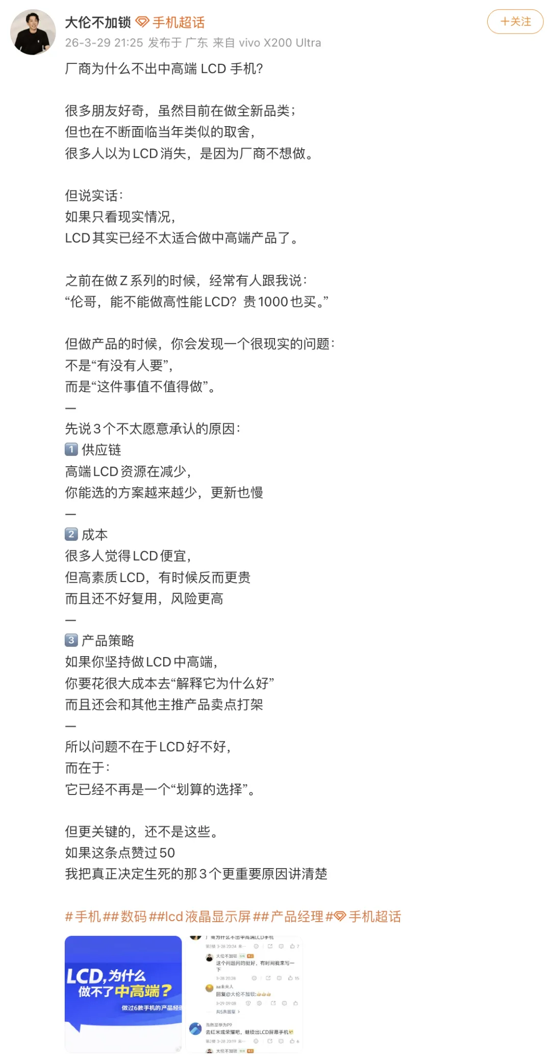 如上图所见,前iQOO Z系列产品经理先说了3个“不太愿意承认的原因”:1️⃣ 供应链高端LCD资源在减少,能选的方案越来越少,更新也慢;2️⃣成本,高素质LCD,有时候反而更贵,而且还不好复用,风险更高;3️⃣ 产品策略,如果坚持做LCD中高端,要花很大成本去“解释它为什么好”,而且还会和其他主推产品卖点打架。