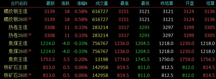 黑色系螺纹钢日度收盘涨18收报3139,期卷涨11收报3308,铁矿石涨0.5收报813,焦煤跌4收报1214,焦炭涨3.5收报1753.5。螺纹钢盘面冲高,60分钟级别小幅反弹,存在技术性反弹修复。