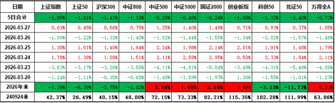 大A相对坚挺,比港股强不少。跌幅相对少,主要是3月23日和3月26日贡献,其他3天都算超跌反弹。中证500、中证1000和国证2000相对抗跌。