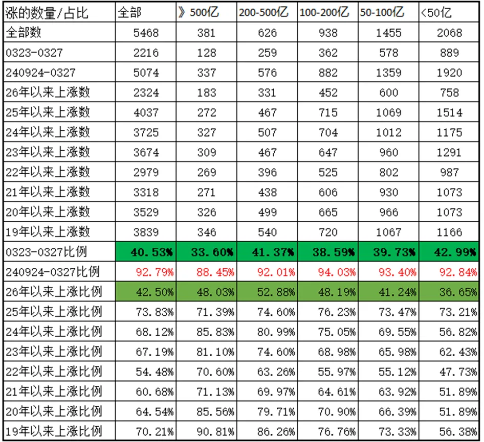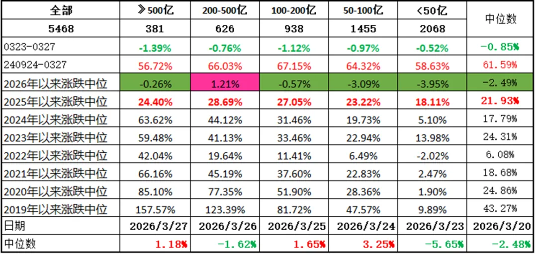 2. 上涨中位数为-0.85%,3月20日那周-5.77%,3月13日那周-1.22%,3月6日那周-3.42%,2026年以来中位数为-2.49%。