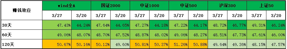 3. 赚钱效应非常一般。赚钱效应有所回升,但30天和60天仍然低于50%且除了上证50和沪深300,基本上赚钱效应都是30天<60天<120。