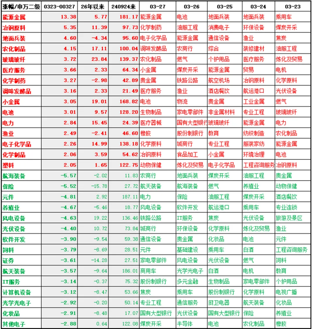 1. 申万124个二级中,45个行业上涨,之前5个……51……25个,本周表现相对较好的行业主要是能源、资源方面行业,为能源金属、冶钢原料、农化制品、医疗服务、小金属、电池电力、化学等行业;而跌幅较多的航海装备、保险、元件、养殖业、风电设备、光伏设备、证券、计算机设备等行业。