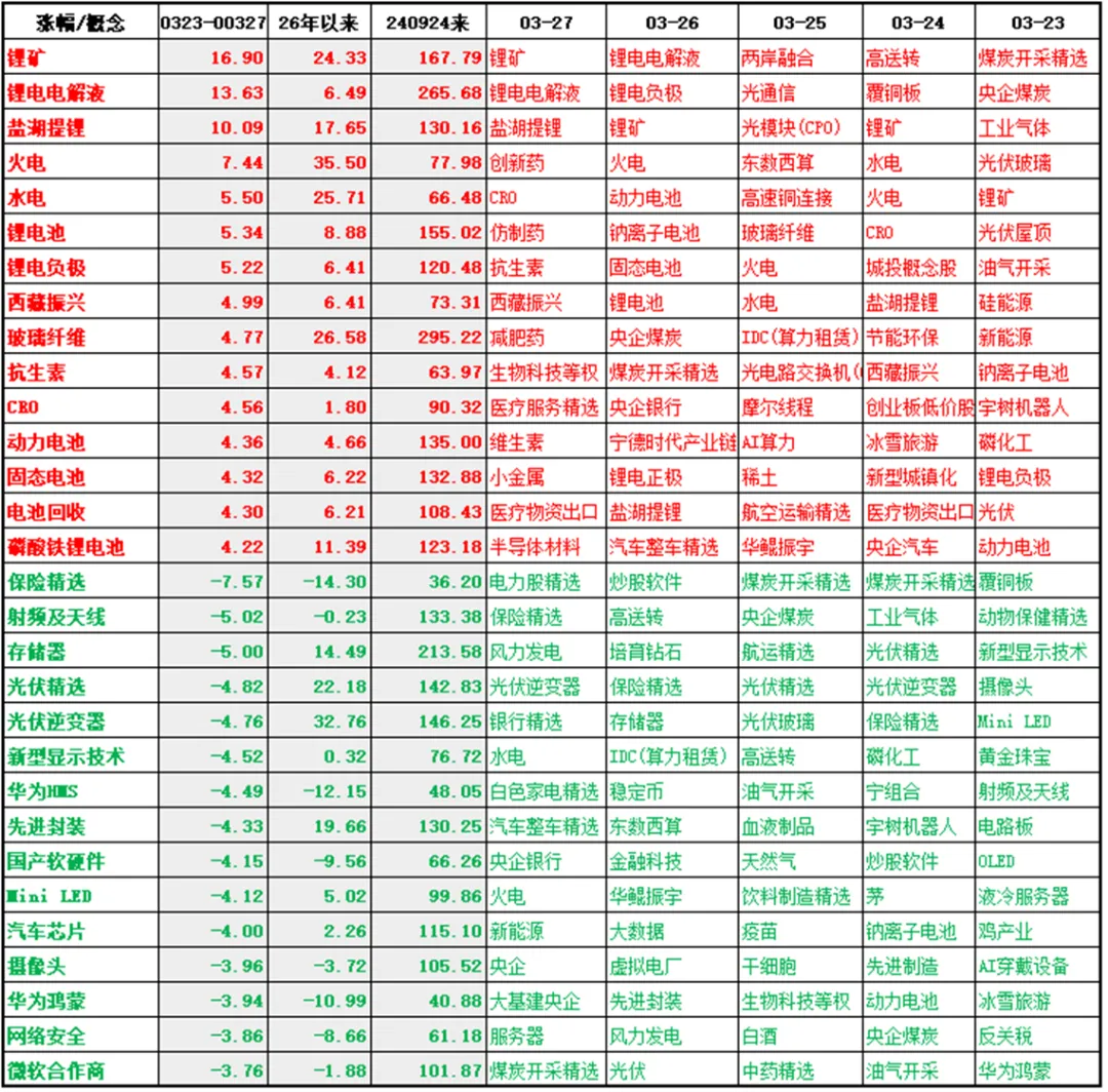 2. 在342个题材中,只有123个上涨,之前为11个……107个……39个。主要仍然为能源相关的锂矿、火电、水电、喊省事、固态电池等;下跌主要为保险、存储、光伏逆变器、芯片、硬件等题材。