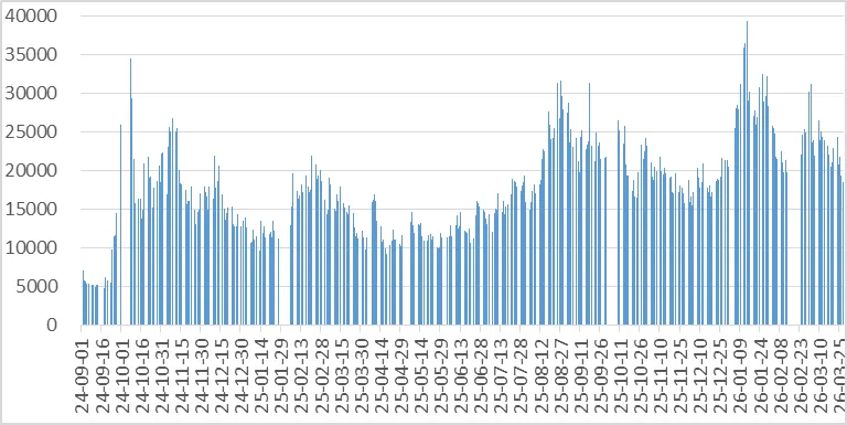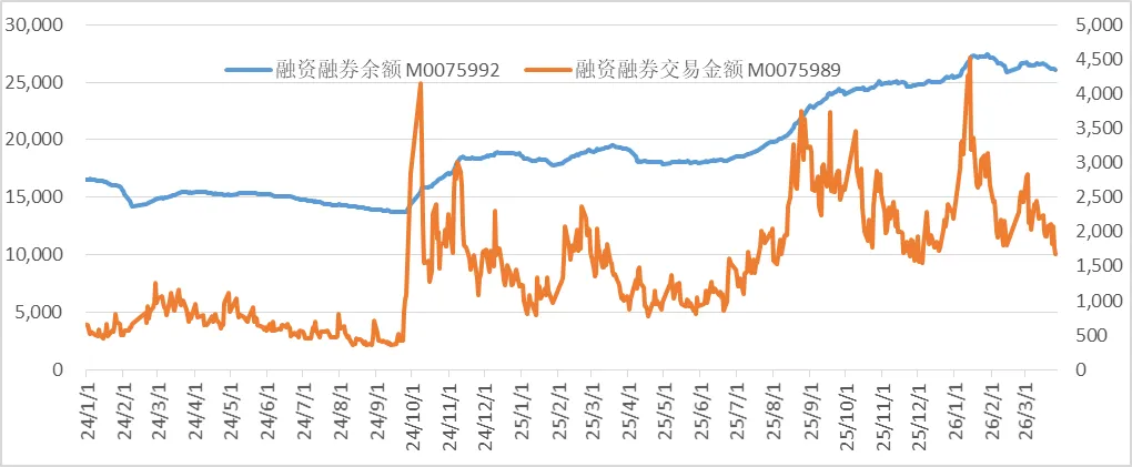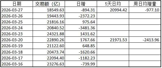 交易量继续不少。沪深日均减少977.1亿,为2.099万亿。3月26日和27日跌破2万亿。