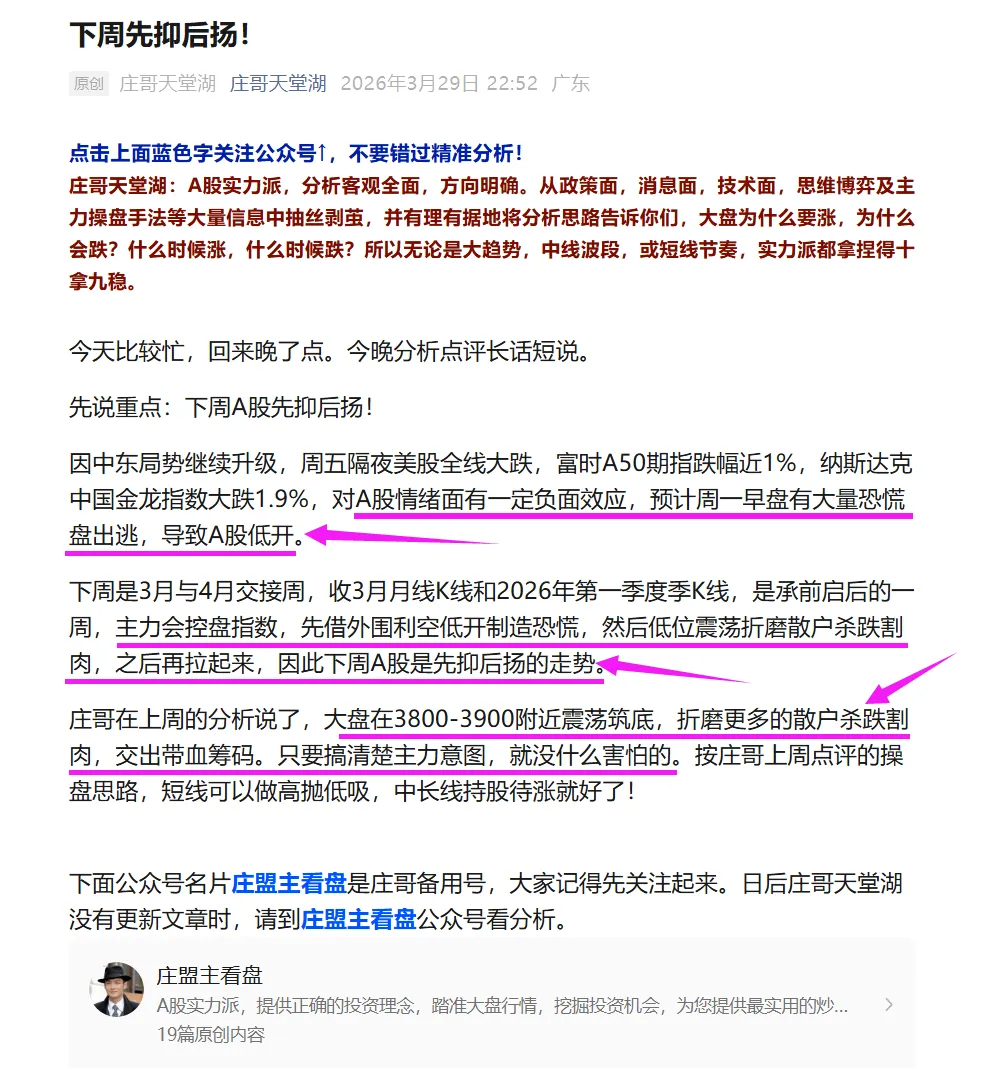 今天A股又硬了一把,早盘低开后惯性下探,大盘在3872点附近探底回升,临近午盘时翻红收复3900点,午后维持在3900上方红盘震荡一直到收盘,最终大盘收在3923点,小幅上涨;创业板探底回升,跌幅收窄。早盘低开时,一度超过4500家个股下跌,随着午后指数回升,收盘后个股涨多跌少,红盘2868家,绿盘2464家。整体而言,在外围诸多利空影响下,当前A股还算比较抗跌的。庄哥昨晚分析说了,中东局势及美股大跌对A股情绪面有一定负面效应,周一早盘有大量恐慌盘出逃,导致A股低开。本周是3月与4月交接周,收3月月线K线和2026年第一季度季K线,是承前启后的一周,主力会控盘指数,先借外围利空低开制造恐慌,然后低位震荡折磨散户杀跌割肉,之后再拉起来,所以断定本周A股是先抑后扬的走势。晚上复盘看了大盘结构,这里没有大问题,短线筑底行情,虽然会受外围情绪影响,但往下空间不大。 个股方面,最近两个月调整过的板块个股,开始陆续筑底反弹,可以低吸布局。对于近期逆势大涨过的高位股,大量获利盘出逃,开始补跌,注意不要半路抄底接飞刀。短线操盘策略,按庄哥上周点评的操盘思路,短线可以做高抛低吸,中长线持股待涨就好了!下面公众号名片庄盟主看盘是庄哥备用号,大家记得先关注起来。日后庄哥天堂湖没有更新文章时,请到庄盟主看盘公众号看分析。