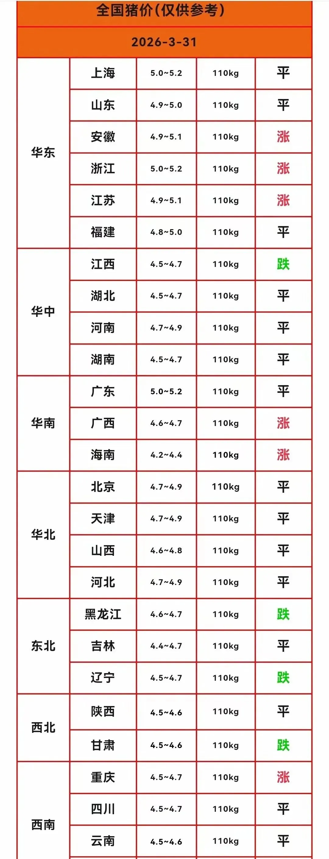 明日(2026年3月31日),全国生猪价格呈现稳中上涨态势,局部地区出现小幅上调。从区域分布来看,全国26个监测区域中,6个地区猪价上涨,4个地区下跌,剩余16个地区价格保持平稳,整体依旧以稳为主。