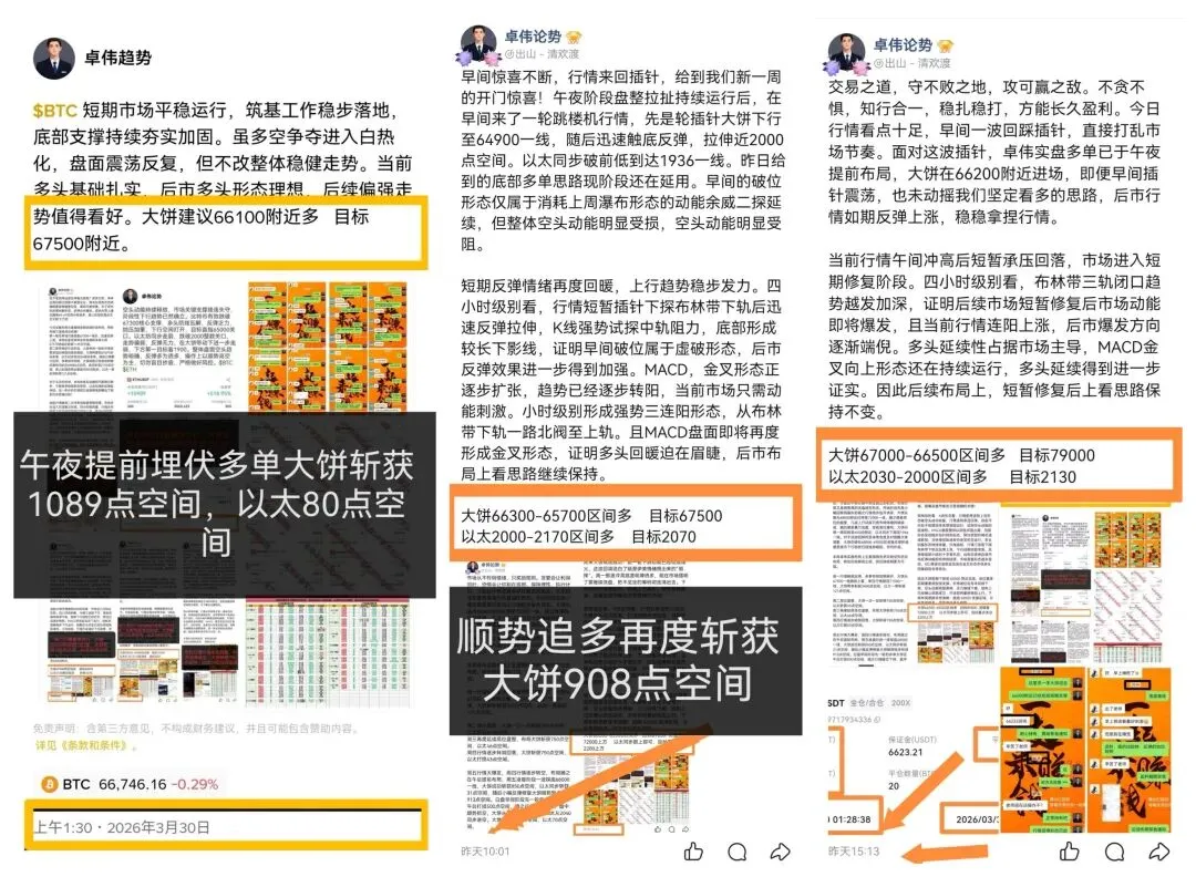 今日实盘三连胜,首轮在午夜阶段开始布局,大饼在66200附近多单进场,以太同步在1989进场。午间大饼成功收网斩获1089点空间,以太在午后行情二探阶段成功收网斩获80点空间。午间大饼行情冲高后企稳大饼随之布局在67159进场,晚间冲高阶段再度收网斩获903点空间。