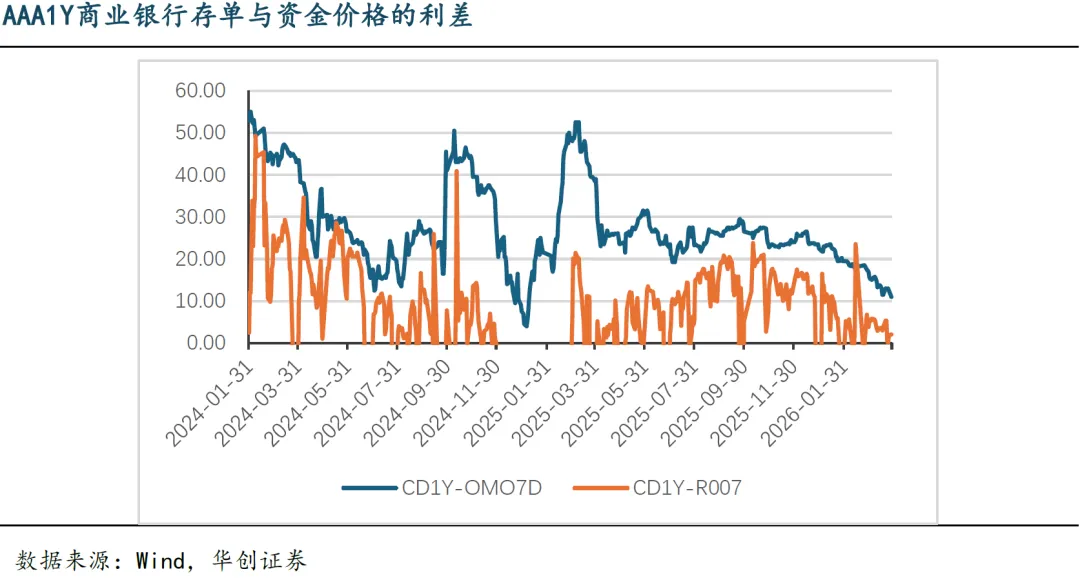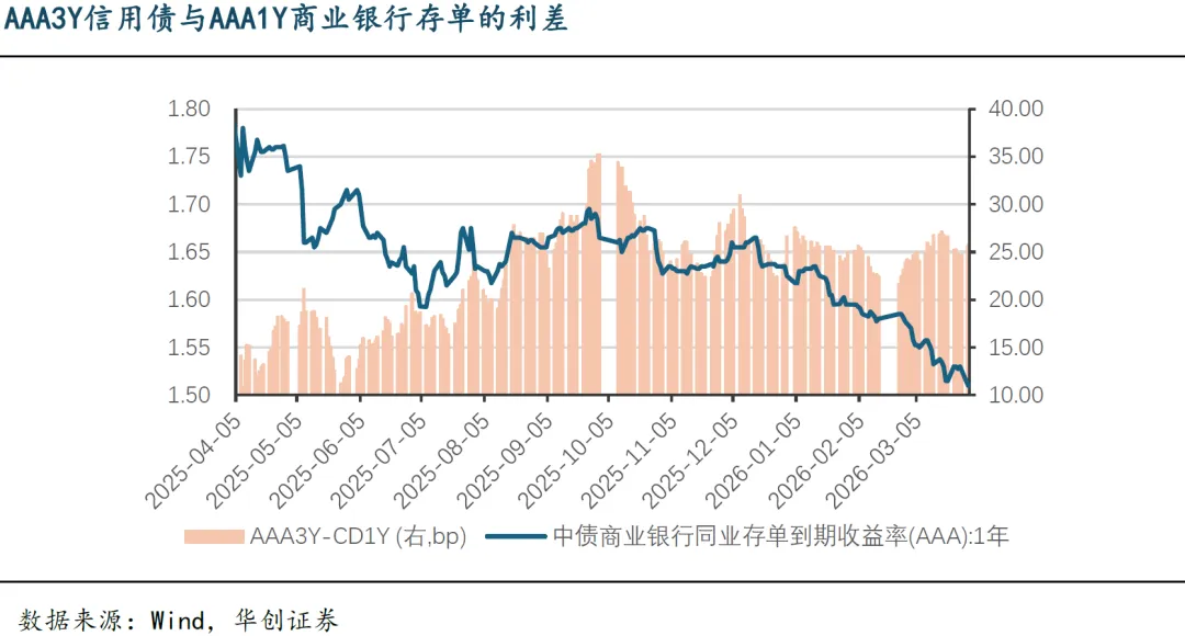 今年年初以来,债券市场长端利率先是超跌修复,后因地缘冲突引起通胀预期升温而上行,近一周再次超跌修复,整体波动较大。相对而言,5年内的普通信用债表现始终强韧,原因一是市场流动性持续充裕、资金面波动不大,为信用债的配置和交易提供了有利环境;二是,机构配置需求较旺盛,年初银行理财“开门红”带来增量资金,同时大量摊余成本法债基集中开放。此外还有一项容易忽视的利好因素是,银行负债端成本的持续下行:如下图所示,年初以来银行同业存单利率持续下行,与此同时信用债与其利差基本上维持稳定,也就是说信用债与存单利率的下行走势是基本保持同步的。今年以来银行同业存单利率的持续下行是供需关系、流动性环境与政策预期共同作用的结果:①从供给端看,银行主动负债需求明显减弱,一方面存款利率下降后银行核心负债成本压降,另一方面信贷需求偏弱也降低了银行通过存单融资的意愿,导致今年前3月同业存单净融资规模为负;②从需求端看,市场流动性持续宽松,现金管理类产品等对短久期资产的配置需求旺盛,形成了有力的承接;③此外,市场对同业存款自律管理升级的预期,也促使部分资金从同业存款转向存单,进一步强化了下行动力。展望后续走势,同业存单利率短期内进一步下行的空间可能已相对有限,或将转入震荡格局:资金利率的中枢水平是存单最核心的定价锚,当前存单利率与政策利率以及R007之间的利差已处于历史低位,尽管短期的供需结构或使存单利率有机会进一步下探,但与资金价格的利差制约了存单利率下探的空间和时间。