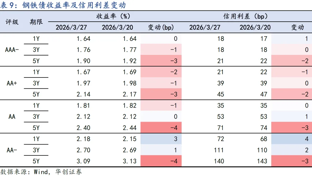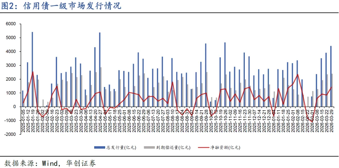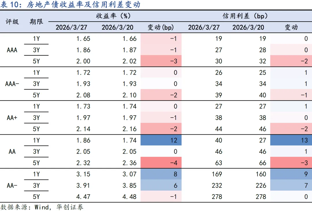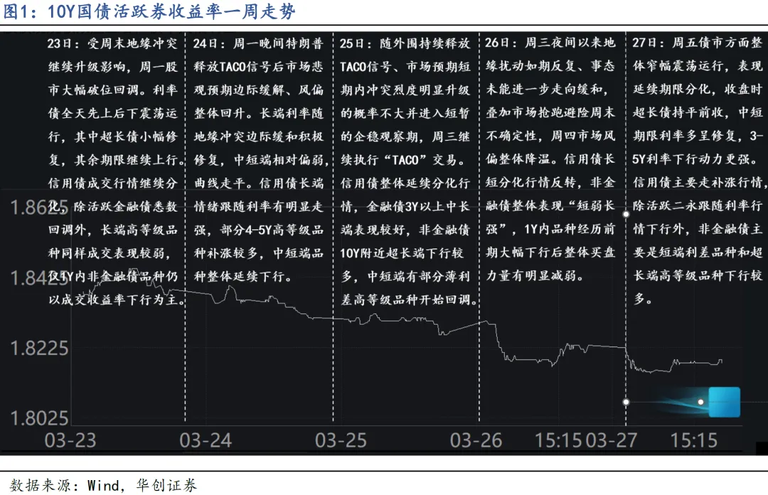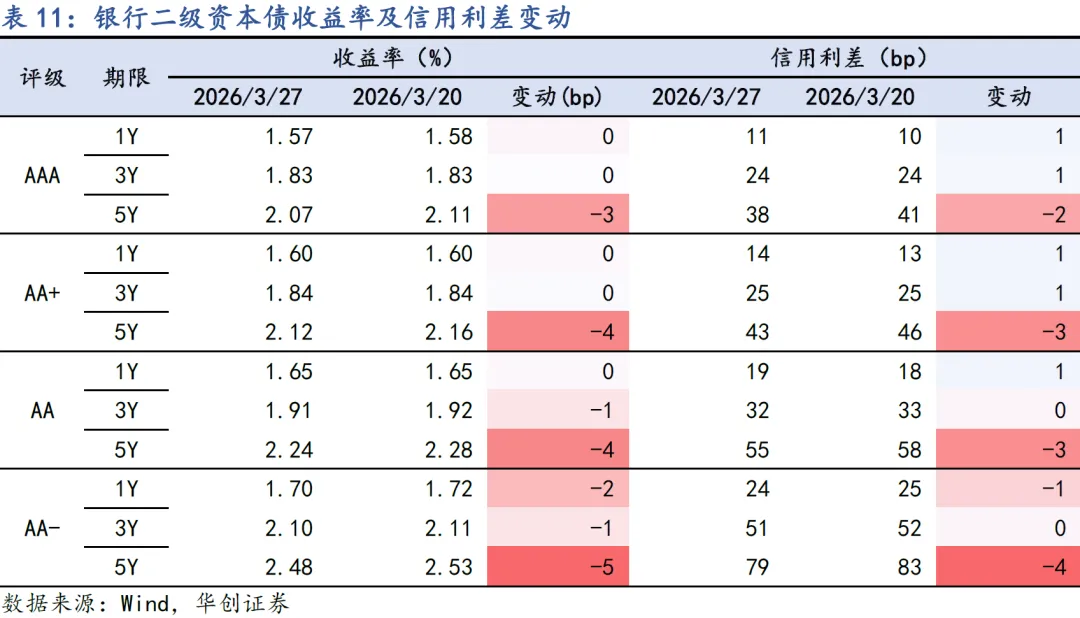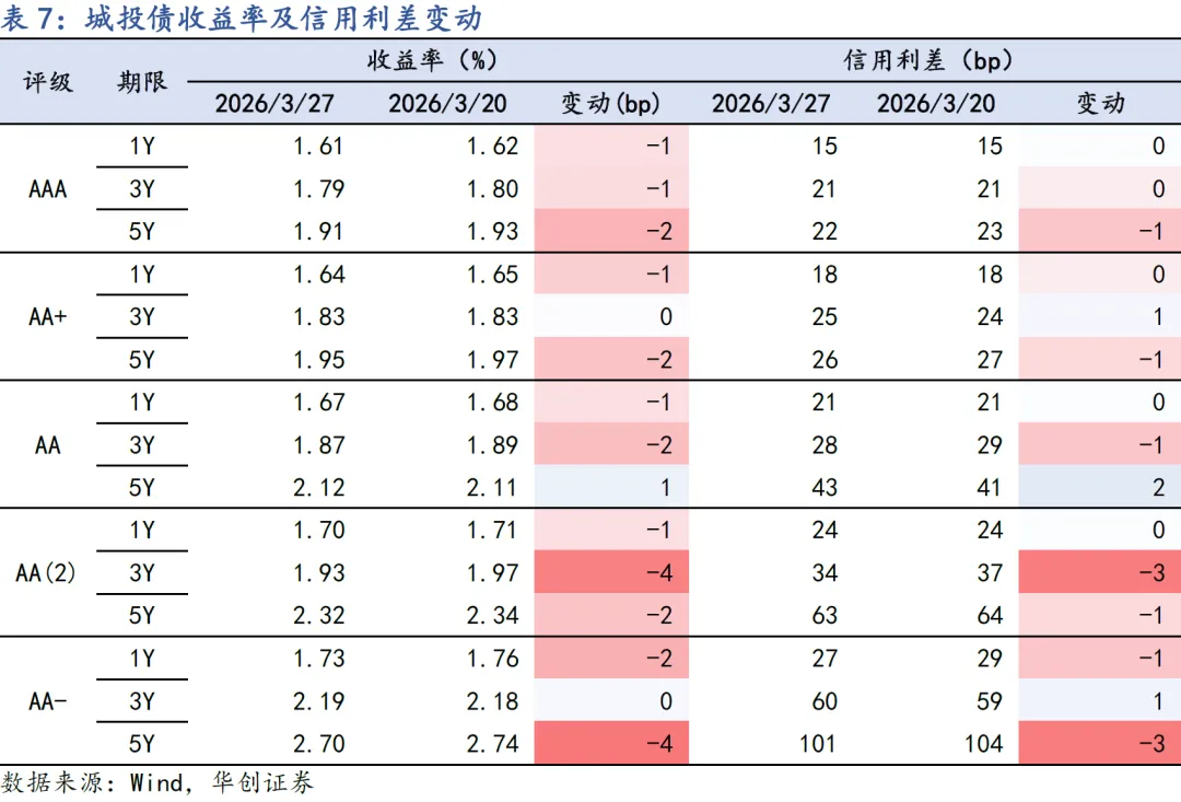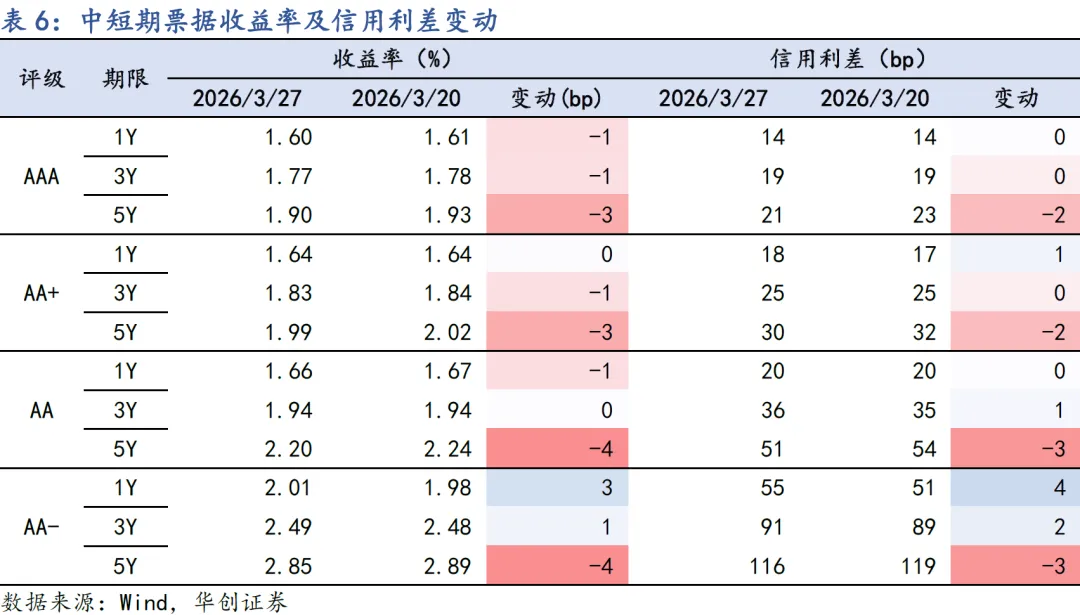上周地缘冲突对债市的影响钝化,长端利率整周下行修复,叠加季末资金面宽松,带动信用债中长期限收益率明显下行;短端信用债下行幅度相对较小,信用利差持平或小幅被动走阔。