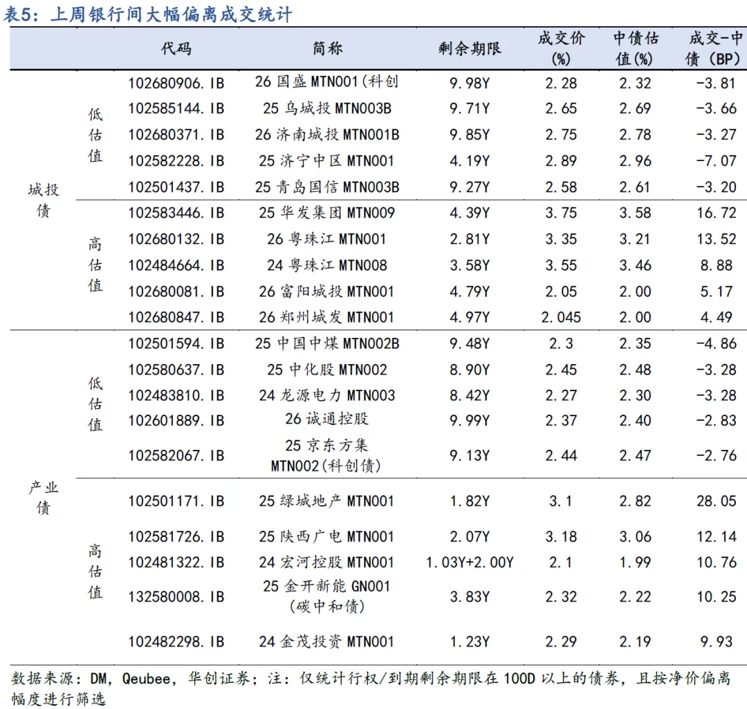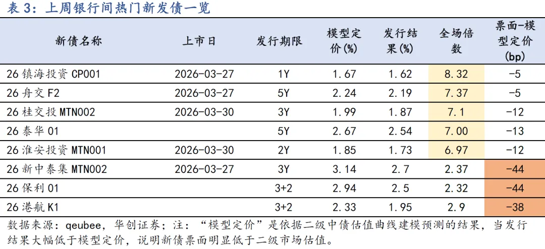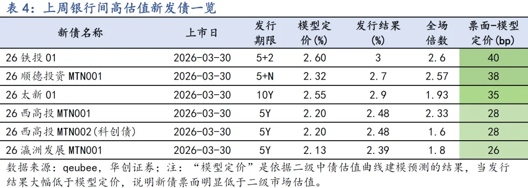 上周票面利率明显高于二级估值的主要为流动性较差的5Y及以上期限的中票和私募公司债品种,部分优质主体发行的债券存在一二级套利机会;如:26铁投01高于二级估值约40bp发在3%,上市后成交在2.78%。