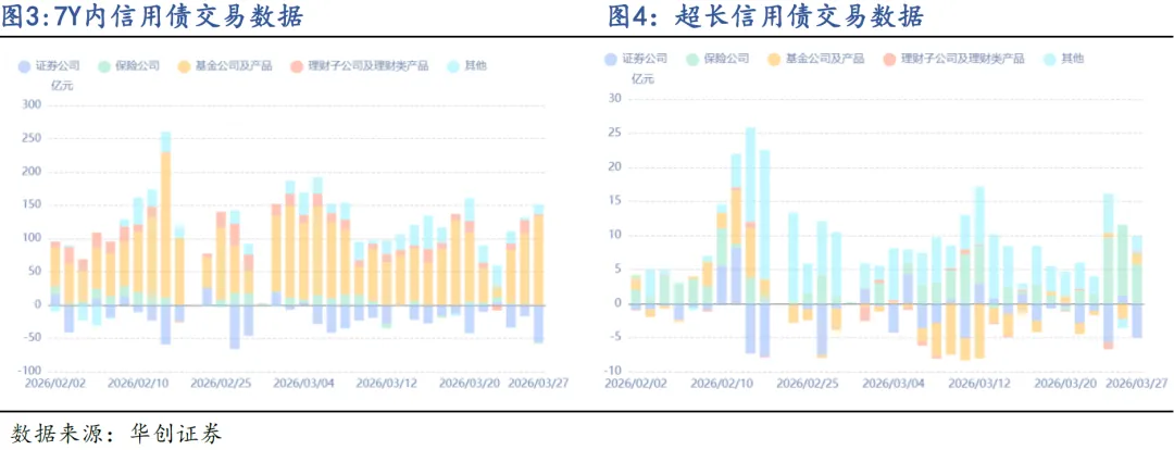 信用债二级市场方面,上周短端的成交收益率下行势能趋弱,3-5Y期限表现较强,7-10Y高等级超长信用债跟随长端利率亦有所下行,收益率曲线整体走平。从估值曲线形态变化来看,信用债整体的成交收益率变化上周呈现“短弱中长强”格局,3Y内品种的收益率变动普遍不超过1bp。分资质来看,不同等级品种的成交行情分化度较低,但3Y内下沉品种的成交表现较弱。信用利差方面,5Y长端品种的信用利差收窄2-3BP左右,3Y内中短端除下沉品种外变动不大。上周二级大幅偏离估值的成交特征如下:由于上周长端利率行情明显修复,10Y附近的高等级超长信用成交收益率大幅下行;而部分前期涨幅较大的5Y内中短端品种的成交行情出现明显回调。从信用债分机构的成交数据看,上周信用债整体成交活跃度在后半周有明显回升,对比前半周,基金公司对中短端、保险公司对超长债的买入力量显著提高。