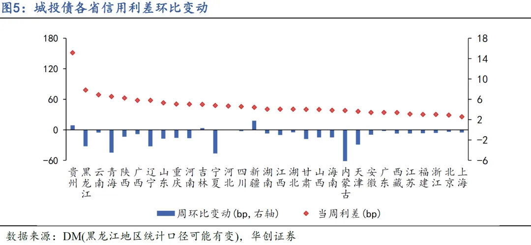 上周各区域的城投债利差轻微收窄,部分差地区收窄更明显。上周城投利差变化较大的区域主要包括以下:内蒙古地区的城投利差收窄10BP左右。本文由华创证券有限责任公司(以下简称“本公司”)投资交易部撰写。本文以投资者教育为目的,并非证券研究报告,不构成任何投资建议。本公司不对读者因使用本文内容所引发的直接或间接损失负任何责任。本文所有信息均来自于公开资料,本公司对本文信息的完整性、准确性和时效性不作任何保证,读者应自主判别并承担相应风险。本文所有图文信息的版权归本公司所有,任何机构或个人在未经本公司事先书面授权,不得修改、转载、翻版或者复制本文内容。如因侵权行为给本公司造成任何直接或间接损失,本公司将依法追究相应的法律责任。