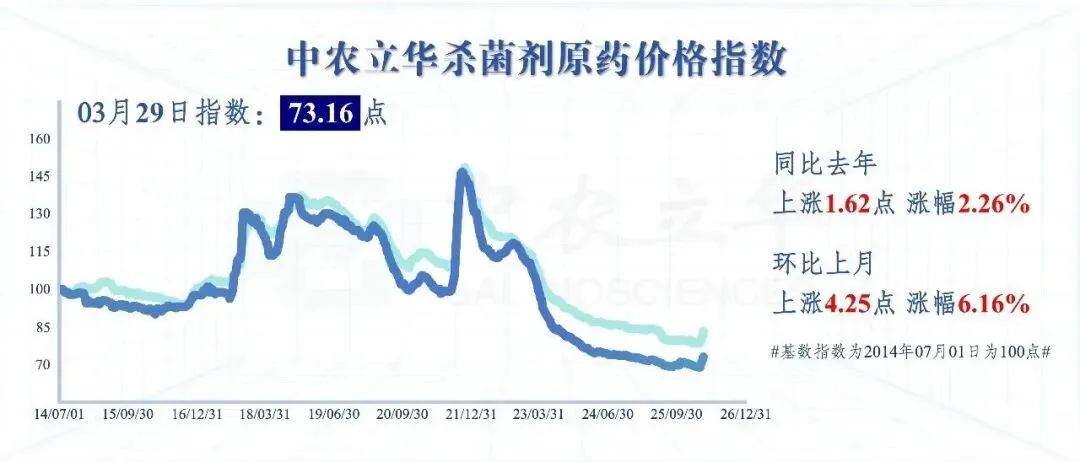 2026年3月29日,中农立华杀菌剂原药价格指数报73.16点,同比去年上涨2.26%,环比上月上涨6.16%。