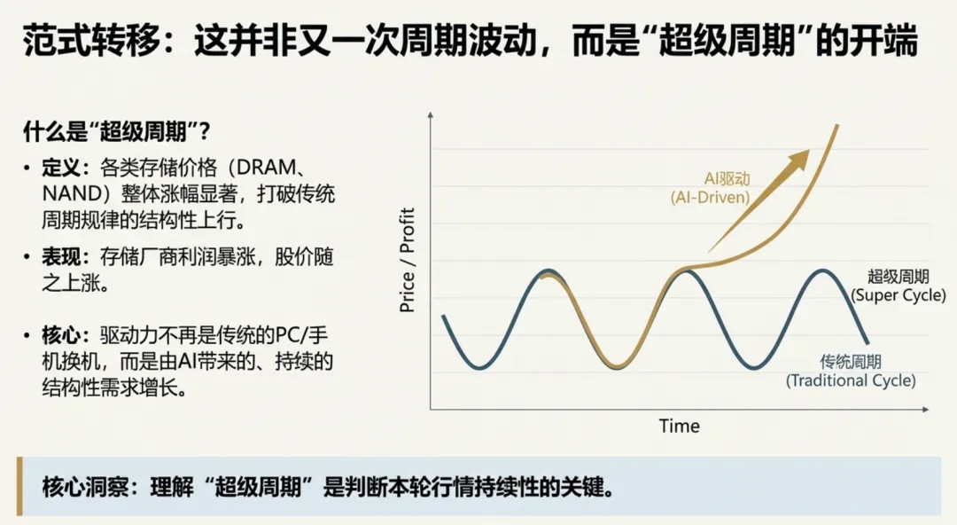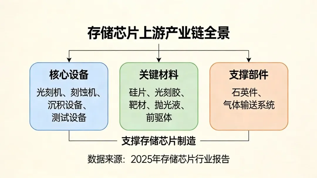 我们之前的分析指出,在价格上涨的初期,最先受益的必然是拥有大量低价存货的模组厂。这就像在房价上涨前夜,手里握有大量土地和现房储备的开发商,利润弹性最大。以佰维存储为例,3月3日的公告可谓直接戳破了天花板:2026年1-2月,短短两个月,净利润就达到了15-18亿元,几乎是2025年全年的业绩的两倍。如果这个势头能维持,2026年全年利润增长近10倍并非天方夜谭。德明利、江波龙等模组龙头,股价在今年也分别录得了72.62%和28.66%的显著涨幅(截至3月30日)。因为它们的商业模式决定了其在涨价初期的巨大优势。模组厂从上游晶圆厂采购存储颗粒,加工成内存条、固态硬盘等产品。在2025年下半年到2026年初的暴涨行情中,它们前期囤积的低成本颗粒瞬间变成了“金矿”,价差利润极为可观。这就像面包坊在面粉价格飙升前,低价囤积了大量面粉,面包售价水涨船高,利润自然暴增。但是,行情不会永远只停留在面包坊。当面粉持续短缺、价格不断上涨时,生产面粉的工厂,以及为面粉厂提供机器设备的公司,好日子也就来了。这就是我们正在进入的第二阶段:行情从下游模组厂,向上游芯片颗粒设计公司传导。产能挤压效应:全球三大存储巨头三星、SK海力士、美光,为了追逐AI带来的更高利润,将大量产能转向了HBM(高带宽内存)等高端产品,导致消费级DRAM和NAND的产能被大幅压缩。这就像面粉厂把生产线都拿去生产高级蛋糕粉了,普通面包粉自然就少了。利基市场崛起:主流存储产品的产能紧张和价格上涨,会“挤出”一部分需求到利基型存储市场(如Nor Flash、SLC NAND、特定规格的DRAM等)。这些领域正是兆易创新、普冉股份等国内芯片设计公司的核心战场。涨价传导:当下游模组厂的产品价格持续上涨,它们对上游芯片颗粒的涨价也有了更强的承受能力。同时,芯片设计公司自身的产能也可能因为晶圆厂排期紧张而受限,从而推动颗粒价格上涨。看看兆易创新。3月30日发布的2025年年报显示,其净利润同比增长了约50%,达到了16.48亿元。但这还不是重点,重点是年报中披露的与长鑫存储的代工交易金额:2025年是11.82亿元,而2026年的预计金额直接跳升至57亿元!这是什么概念?这意味着兆易创新对2026年的产能需求是去年的近5倍!如果这个预期能够实现,兆易创新2026年的净利润有望冲击50亿元大关。这背后反映的,正是上游芯片设计公司订单饱满、量价齐升的乐观预期。普冉股份今年的涨幅也达到了87.96%,同样印证了市场对上游设计公司价值重估的认可。如果说模组厂是面包坊,芯片设计公司是面粉厂,那么为面粉厂提供磨面机、烤箱、厂房的公司,就是设备和材料供应商。这轮超级周期的第三阶段,也是最具长期确定性的阶段,就是上游设备和材料厂商的大爆发。国产替代的迫切需求:这轮“卡脖子”的存储短缺,让所有人都清醒地认识到,没有自主可控的晶圆制造能力,一切都如空中楼阁。长鑫存储(DRAM)、长江存储(NAND)和中芯国际(逻辑芯片)的扩产,不仅是商业行为,更是国家战略。千亿级的资本开支:资料显示,“两长一芯”未来2026年的扩产投资将超过2000亿元。这笔巨量资金,最终会流向哪里?很大一部分会用于购买晶圆制造设备(如光刻机、刻蚀机、薄膜沉积设备等)和消耗大量材料(如硅片、光刻胶、电子特气等)。业绩兑现的先后顺序:在晶圆厂的建设周期中,设备采购会最先发生,因此设备厂商的业绩会最先兑现。随着晶圆厂投产,对材料的持续消耗需求才会跟上,材料厂商的业绩增长则更具持续性。所以,我们可以看到,在佰维存储、兆易创新等股价创出新高时,封装测试领域的长电科技、通富微电也双双涨停,这正是行情向产业链更上游扩散的信号。第一阶段(2025-2026H1):AI需求爆发,巨头产能转向HBM,消费级存储供给锐减,价格暴涨。拥有低价存货的模组厂(佰维存储、德明利等)业绩弹性最大,股价率先反应。第二阶段(2026H2开始):价格上涨和产能紧张从下游向上游传导。利基型存储需求被激活,芯片设计公司(兆易创新、普冉股份等)订单和价格双升,业绩开始快速跟上。第三阶段(贯穿未来3-5年):国产替代成为共识,长鑫、长存、中芯等大规模扩产。上游设备厂商率先受益,随后材料厂商接力,共同迎来一轮由资本开支驱动的确定性增长。这轮行情的本质,不是简单的“缺货涨价”,而是一场由AI技术革命引发的、叠加了国产替代历史机遇的结构性超级周期。对于普通投资者而言,理解这个传导逻辑至关重要。它告诉我们:机会正在从下游向上游转移,芯片设计和设备材料领域的龙头公司,其价值正在被市场重新发现。投资的视角,需要从短期的“涨价博弈”,转向长期的“技术成长”和“国产替代”逻辑。当然,任何投资都有风险。我们需要密切关注上游晶圆厂的扩产进度、AI需求的持续性以及全球宏观经济的变化。但无论如何,一个由技术和产业变革驱动的超级周期已经开启,我们能做的,就是看清方向,保持耐心,与时代共舞。欢迎扫码加入【德哥的知识星球】,这里不仅有德哥的详细研究结论和实操案例,还有日常投资机会提示,及时的操作提醒,更重要的是德哥这里没有马后炮,只有提前一步的思考。本文章所载内容为作者个人观点和思考记录,基于公开信息和主观分析,旨在分享交流,不构成任何形式的投资咨询建议和交易决策依据。市场有风险,投资需谨慎。文中提到的行业趋势
