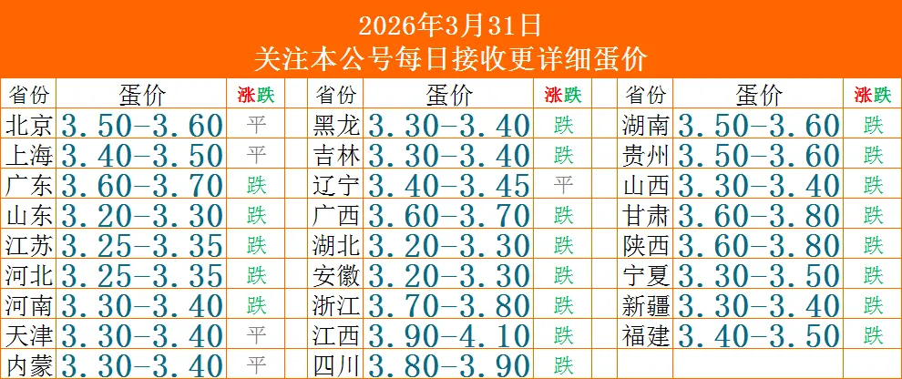 下图为3月31日全国鸡蛋价格表 仅供参考!