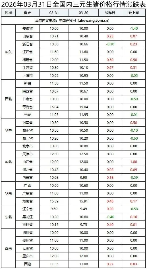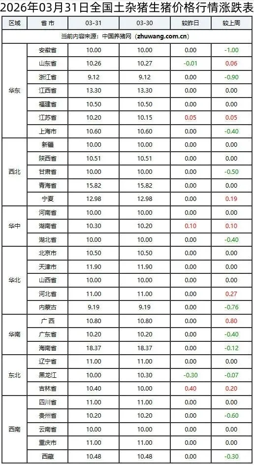 >2026年03月31日全国生猪价格行情涨跌表