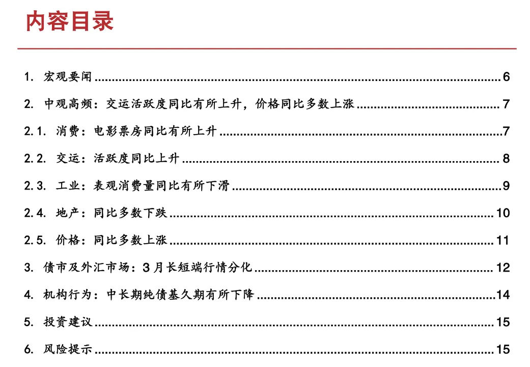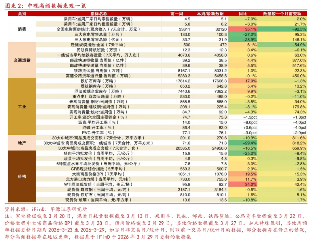 中观高频:交运:截至3月22日,当周民航保障航班数同比+3.4%。截至3月27日,近7天一线城市地铁客运量平均同比+0.6%。截至3月22日,当周铁路货运量同比+1.0%,当周高速公路货车通行量同比-0.1%。工业:截至3月13日,当周重点电厂煤炭日耗量同比-0.2%。截至3月27日,当周钢材表观消费量同比-3.5%,当周螺纹钢表观消费量同比-8.1%。价格:截至3月29日,当周猪肉平均批发价同比-25.2%,较4周前-8.4%。截至3月27日,当周北方港口动力煤平均价同比+11.7%,较4周前+3.9%,当周WTI原油平均现货价同比+34.0%,较4周前+42.4%。