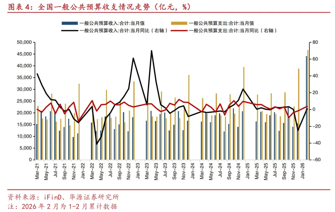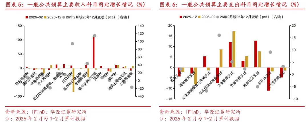 2.26年1-2月一般公共预算收入和支出同比均有所回升。1-2月,全国一般公共预算收入4.4万亿元,同比增长0.7%。其中,全国税收收入3.6万亿元,同比增长0.1%;非税收入0.8万亿元,同比增长3.4%。其中,印花税1143亿元,同比增长34.7%,证券交易印花税499亿元,同比增长1.1倍。1-2月,全国一般公共预算支出4.7万亿元,同比增长3.6%。分中央和地方看,中央一般公共预算本级支出0.5万亿元,同比增长4.5%;地方一般公共预算支出4.1万亿元,同比增长3.5%。