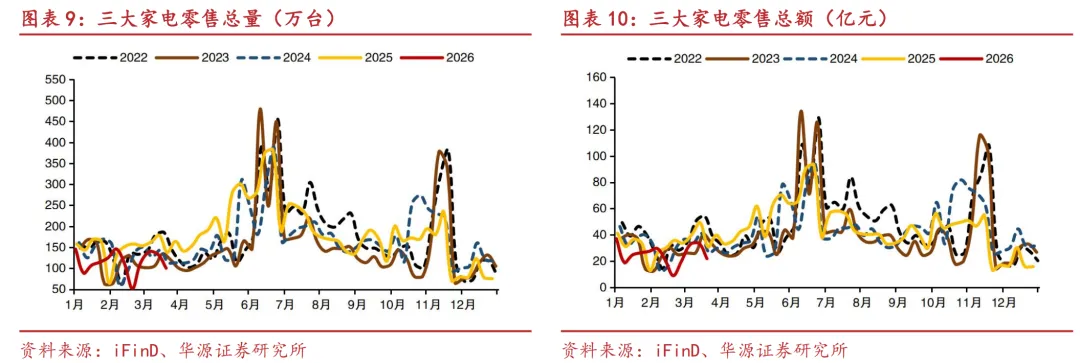 截至3月20日,当周三大家电零售总量为100.3万台,同比-27.2%,当周三大家电零售总额为21.9亿元,同比-28.9%。