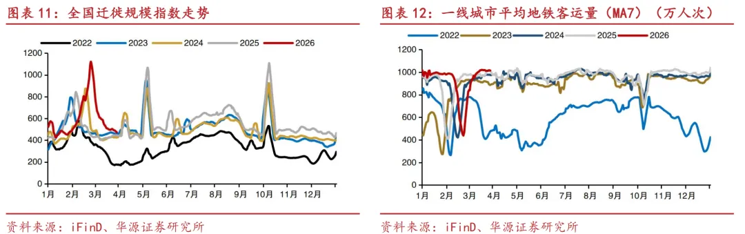 截至3月28日,近7天迁徙规模指数平均为472.3,同比+6.1%。截至3月22日,当周民航保障航班数为12.3万班,同比+3.4%。截至3月27日,近7天一线城市地铁客运量平均为4056.0万人次,同比+0.6%。