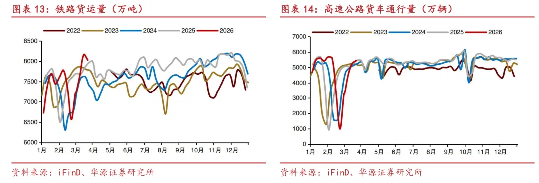 截至3月22日,当周邮政快递揽收量为38.5亿件,同比+4.4%,当周邮政快递投递量为38.9亿件,同比+5.5%,当周铁路货运量为8031.2万吨,同比+1.0%,当周高速公路货车通行量为5458.5万辆,同比-0.1%。