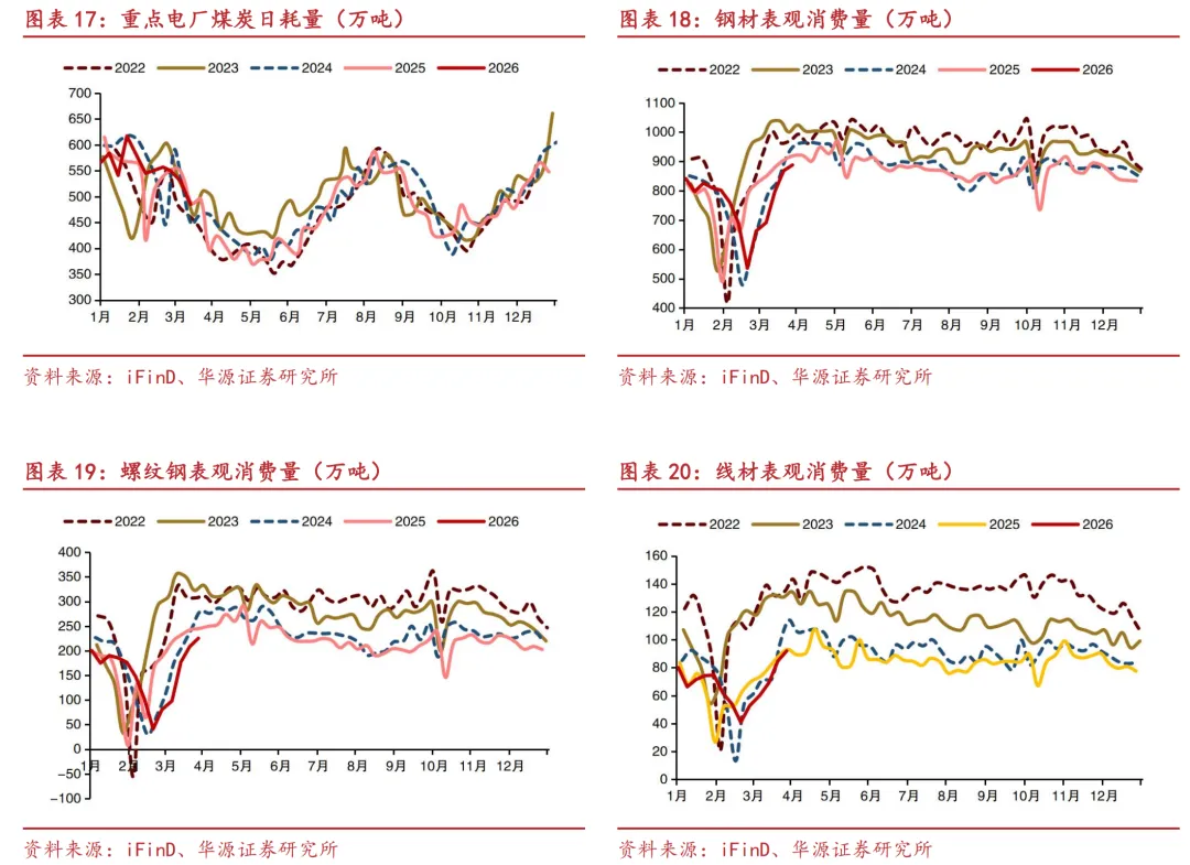 截至3月13日,当周重点电厂煤炭日耗量为485.0万吨,同比-0.2%。截至3月27日,当周钢材表观消费量为888.0万吨,同比-3.5%,当周螺纹钢表观消费量为225.4万吨,同比-8.1%,当周线材表观消费量为92.0万吨,同比-4.3%。