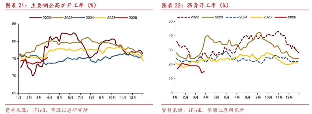 截至3月25日,当周全国主要钢企高炉开工率为75.3%,同比-1.3pct。截至3月26日,当周沥青平均开工率为15.0%,同比-8.0pct,当周纯碱开工率为82.0%,同比+0.6pct,当周PVC开工率为76.1%,同比-3.0pct。