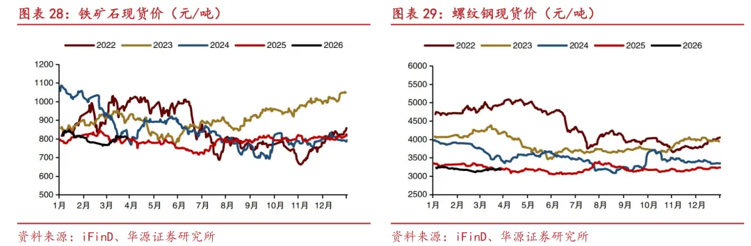 截至3月27日,当周螺纹钢现货价平均为3184.4元/吨,同比-0.6%,较4周前+1.6%,当周铁矿石现货价平均为810.1元/吨,同比+1.6%,较4周前+5.1%,当周玻璃现货价平均为13.5元/平方米,同比-10.8%,较4周前+1.7%。
