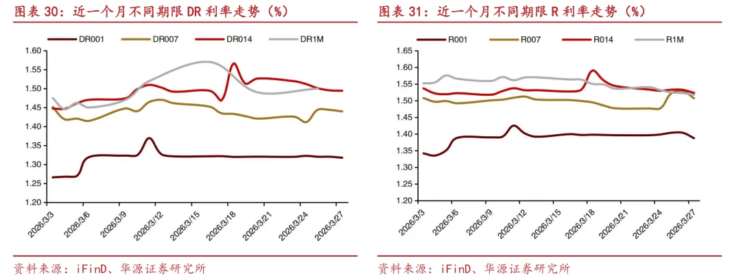 3月27日,隔夜Shibor为1.32%,较3月23日持平,较3月16日下行0.30BP。3月27日,R001为1.39%,较3月23日下行0.90BP,较3月16日下行1.22BP;R007为1.51%,较3月23日上行3.06BP,较3月16日下行0.53BP。3月27日,DR001为1.32%,较3月23日下行0.24BP,较3月16日下行0.38BP;DR007为1.44%,较3月23日上行1.39BP,较3月16日下行1.25BP。3月27日,IBO001为1.37%,较3月23日上行0.03BP,较3月16日下行0.27BP;IBO007为1.47%,较3月23日上行0.57BP,较3月16日下行0.97BP。