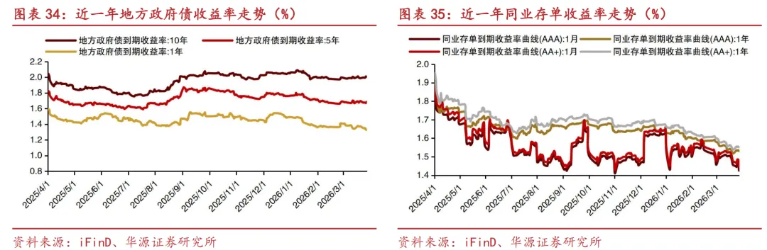 3月27日,地方政府债1年期/5年期/10年期到期收益率分别为1.33%/1.69%/2.00%,较3月20日分别-4.5BP/-1.0BP/+1.7BP,较3月13日分别-1.5BP/+1.7BP/+1.7BP。3月27日,同业存单AAA1月期/1年期、AA+1月期/1年期到期收益率分别为1.43%/1.53%/1.45%/1.55%,较3月20日分别-3.0BP/+1.3BP/-3.0BP/+1.3BP,较3月13日分别-7.7BP/-0.4BP/-7.7BP/-0.4BP。