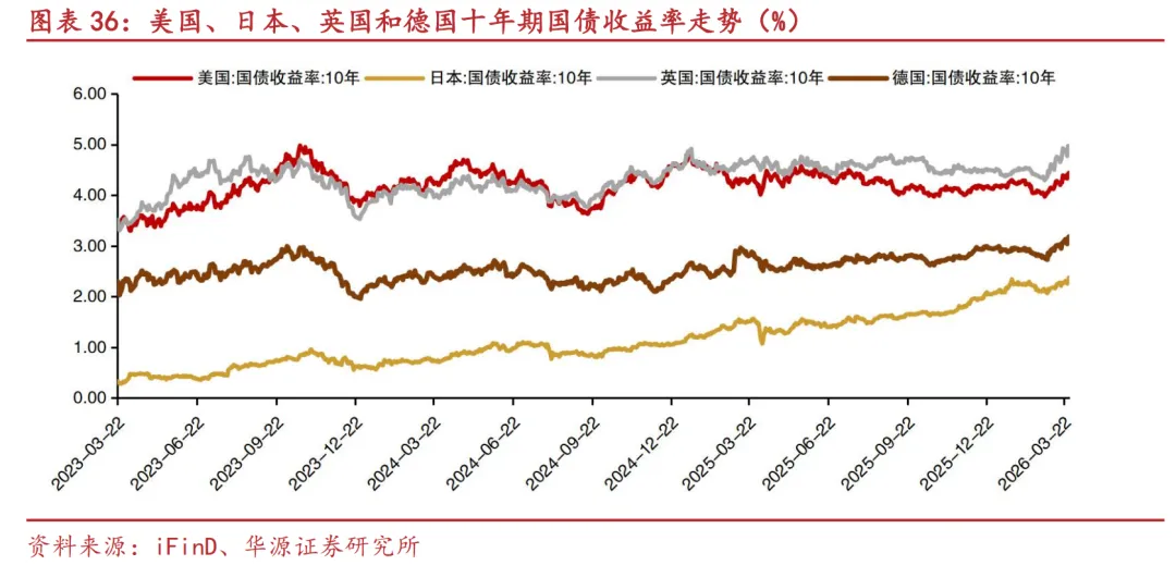 截至2026年3月27日,美国、日本、英国和德国的十年期国债收益率分别为4.44%、2.38%、4.97%和3.18%,较3月13日分别+16BP/+13.5BP/+21.4BP/+17BP。