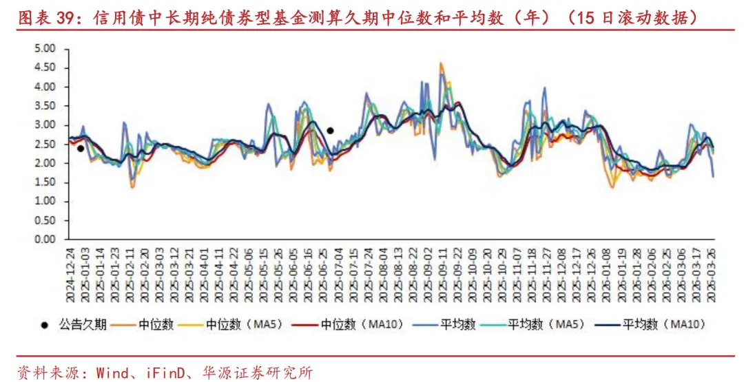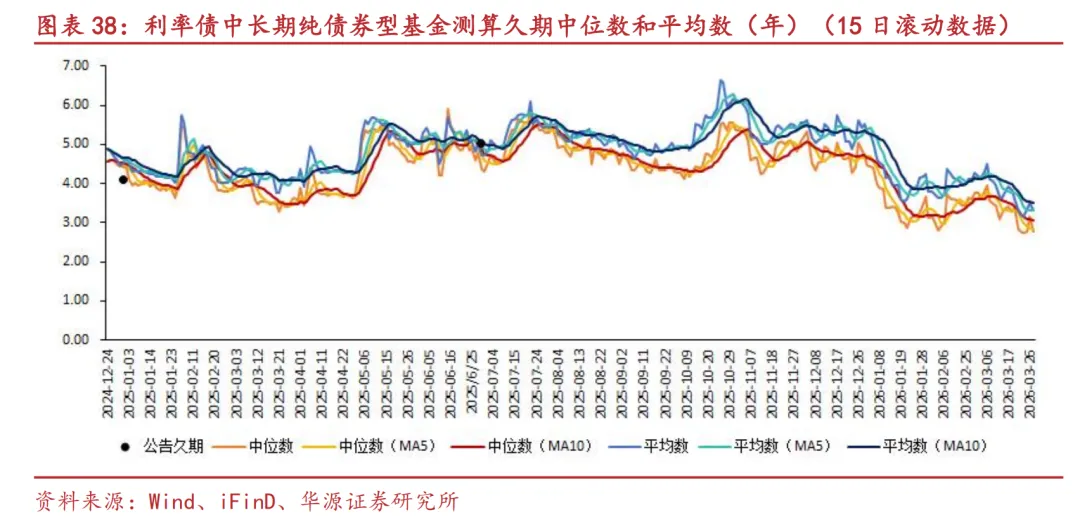 从我们的测算结果来看,2025年初以来,利率债中长期纯债券型基金久期上半年整体呈现上升的趋势,25年7月中旬后有所回落,10月中下旬短暂回升后,自11月上旬起,利率债基久期整体快速下降,26年2月以来维持较低位置,2026-03-27测算的久期中位数在2.8年左右,相较3月13日下降了0.48年左右。