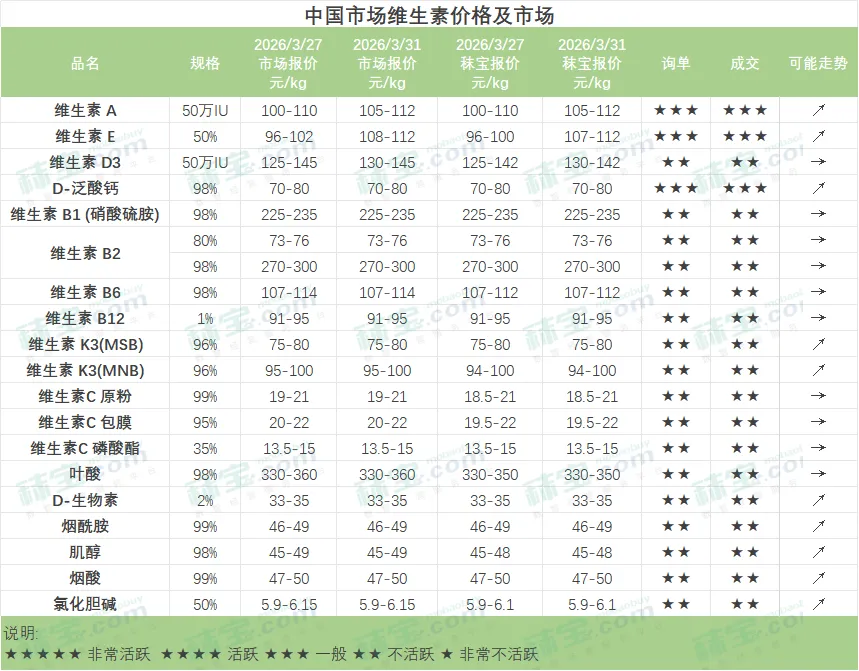 中国维生素市场部分品类价格延续涨势,市场询单积极。维生素A国内有主流厂家停报停签,询单采购积极,市场价格缓涨。维生素E主流厂家大多停报停签,贸易渠道询单交投活跃,VE市场价格继续攀高。维生素D3主流厂家停报停签,市场价格小幅偏强运行。维生素B1、B2有厂家停报停签,市场价格暂稳。氯化胆碱原料供应紧张,工厂搭配发货,市场价格偏强。