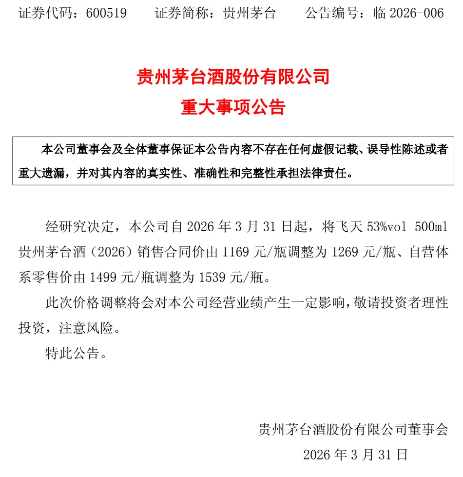 昨晚贵州茅台公告,自今日起对飞天提价,销售合同价由1169元/瓶上调至1269元/瓶,自营体系零售价由1499元/瓶调整为1539元/瓶。零售价提价40,接近昨日市场行情价1550。标志着定价由以前的“双轨制”向“随行就市”变换,将大部分利润收回茅台。