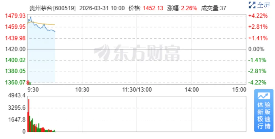 茅台股市方面的反应,早盘一度涨超3%,最高1452.96。
