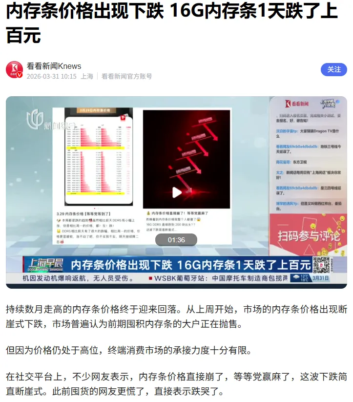此前,美伊局势紧张推高全球能源、物流成本,间接增加了内存生产、运输环节的开支。如今局势逐步缓和,油价回落、海运成本下降,让内存厂商的生产成本显著降低,价格具备了“下行空间”。