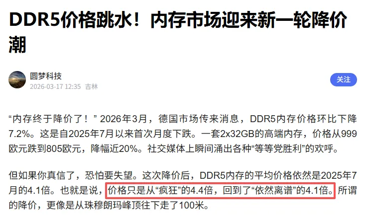 随着DDR5技术成熟、成本下降,DDR4逐渐被替代,厂商开始加速清理DDR4库存,同时DDR5主流型号也通过降价提升渗透率,进一步拉低了整体内存均价。