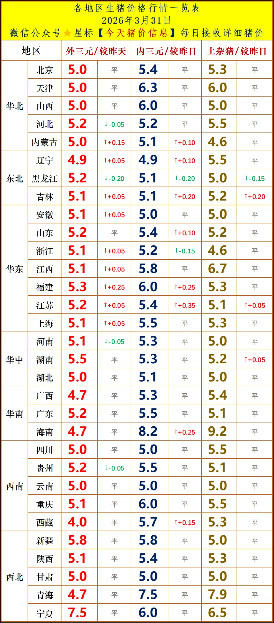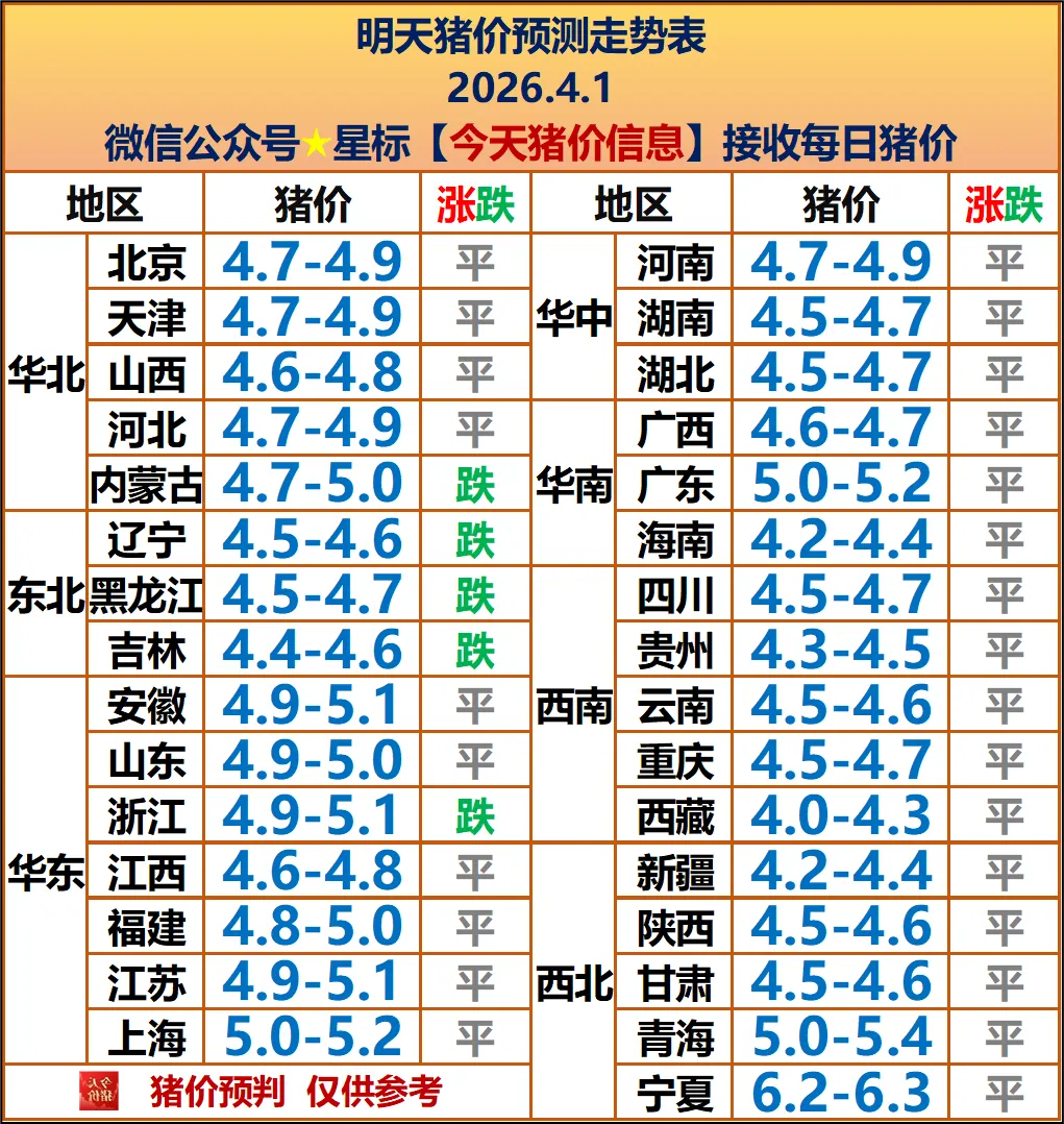 明天4月1日猪价整体平稳为主、区域分化。全国标猪均价约4.2~5.2元/斤,华东、华南局部微涨,东北、西北小幅回调,多数省份持平。清明前消费有小幅提振,但冻品库存高、供应压力仍在,屠企压价意愿强,猪价难大涨。